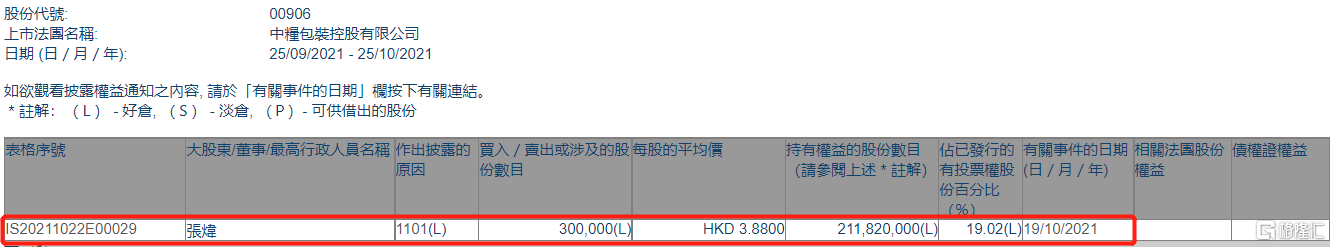 格隆汇APP获悉,根据联交所最新权益披露资料显示,2021年10月19日,中粮包装(00906.HK)获股东张炜在场内以每股均价3.88港元增持30万股,涉资约116.4万港元。