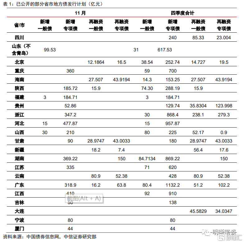 地方债方面,10月专项债的净融资已经明显提速,预计11月仍将保持,净融资额可能达到4500亿元。自7月30日中央政治局会议明确提出合理把握预算内投资和地方政府债券发行进度,推动今年底明年初形成实物工作量后,地方专项债发行开始提速。截至10月24日,多地已经发布了10月的地方债发行计划,根据计划,10月新增地方专项债和一般债合计约3600亿元,考虑到部分地方政府债券发行计划尚未披露,统计数据并不全面,特别是部分发行大省,如安徽暂未公布发行计划,因此我们认为最终地方债净融资规模在4500亿元附近。值得注意的是,证券时报网报道显示,据央视新闻22日消息,财政部相关负责人在发布会上表示,2021年新增专项债券额度将尽量在11月底前发行完毕,从这一目标结合当前的剩余情况来看,地方债净融资额可能会上升至7000亿元。