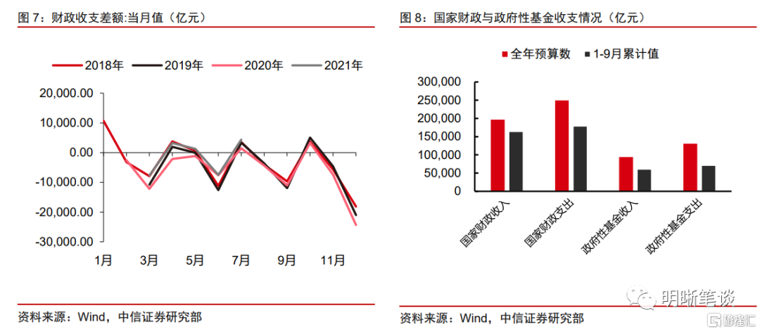 公共财政季节性规律明显,季初月往往“收大于支”,季末月则正相反,但四季度财政支出力度料将加大,11月预计支出力度将高于往年同期。参考国家财政与政府性基金的预算数与最新公布的9月执行情况,我们预计后续仍有较大的执行压力。10-12月国家财政支出较预算仍余7.1万亿元,政府性基金支出额度仍余4.7万亿。政府强调积极的财政政策要提升政策效能,在跨周期调节的思路下,结合收入部分情况,我们预计10月财政收支差额(不考虑政府债净融资)整体可能达到-17000亿元,一定程度上减小流动性缺口。