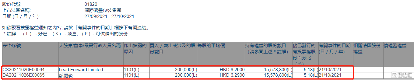 济丰包装(01820.HK)获主席郑显俊增持20万股