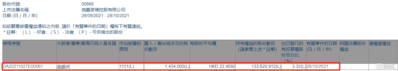 格隆汇APP获悉,根据联交所最新权益披露资料显示,2021年10月26日,信义玻璃(00868.HK)获非执行董事吴银河在场内以每股均价22.4092港元增持143.4万股,涉资约3213.5万港元。