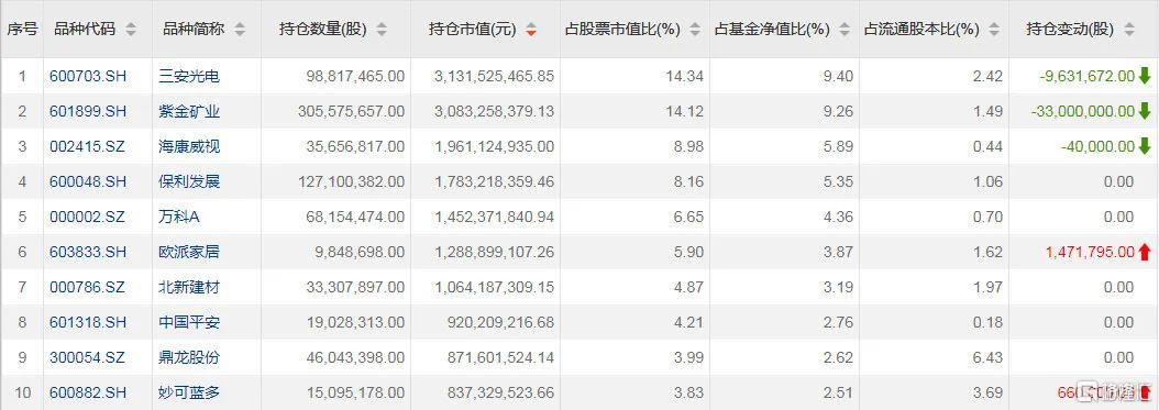 以兴全趋势投资为例,从股票仓位(权益投资占基金总资产比例)来看,截至三季度,兴全趋势投资仍保持低位运行,股票仓位从二季度末的63.22%略升至65.35%。从基金前十大重仓股来看,三季度,董承非加仓了欧派家居、妙可蓝多,对三安光电、紫金矿业、海康威视的持仓股数有所减少。
