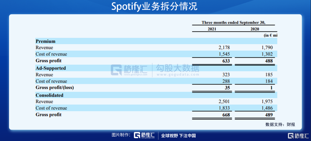 Spotify的商業模式比較好理解,分爲兩塊收入:一塊是訂閱會員收入,一塊是廣告。