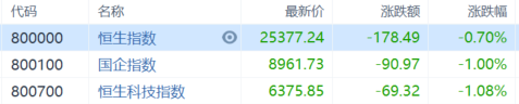 今日,港股三大指数集体收跌,科技股走弱致大市情绪低迷,恒指跌0.7%报25377点走出4连跌,国指跌1%报8961点,恒生科技指数跌1%报6375点。大市成交额为1262亿港元,南下资金逆势净流入19.7亿港元。