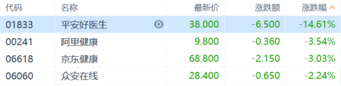 互联网医疗板块领跌,平安好医生跌超14%,阿里健康、京东健康跌超3%,众安在线跌超2%。