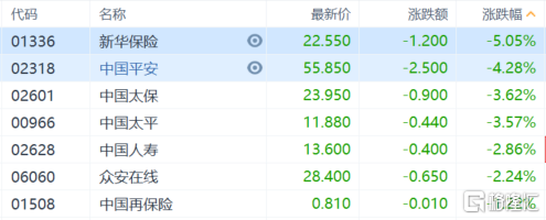 保险股大跌,新华保险跌超5%,中国平安跌超4%,中国太保、中国太平跌超3%,中国人寿跌超2%。
