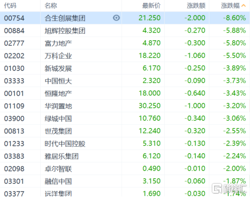 内房股走弱,合生创展跌超8%,旭辉控股、富力地产、万科跌超5%,新城发展、中国恒大、恒隆地产、华润置地、绿城中国跌超3%,世茂集团、时代中国、融信中国跌超2%。