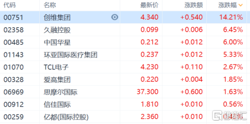 消费电子板块领涨,创维集团涨超14%,久融控股、中国华星涨超6%,TCL电子涨超2%。
