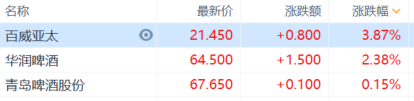 啤酒股表现活跃,百威亚太涨超3%,华润啤酒涨超2%,青岛啤酒跟涨。