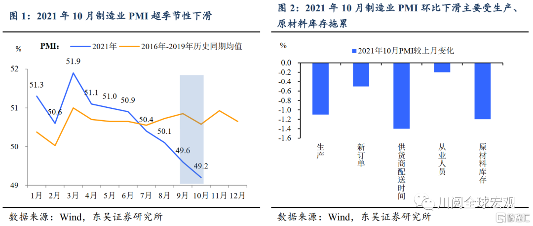 在9月经历了拉闸限电的供给冲击后,市场普遍预期10月制造业PMI将出现小幅反弹。而今日国家统计局公布的2021年10月制造业PMI和非制造业PMI均较9月环比下滑,并创下近10年同月最低值。这意味着经济“逆风”下行压力仍然较大,四季度GDP破“4”的概率也在加大。我们将2021年10月PMI的主要特征归纳为如下三点:(1)从产需来看,由于供电紧张、能耗双控、原材料价格偏高对供给端形成直接约束,10月生产端环比表现逊于需求端。(2)新出口订单PMI止跌,但仍处于收缩区间。(3)非制造业结构上出现改善信号,服务业剔除季节性环比略有改善,建筑业新订单和业务活动预期均环比上行。