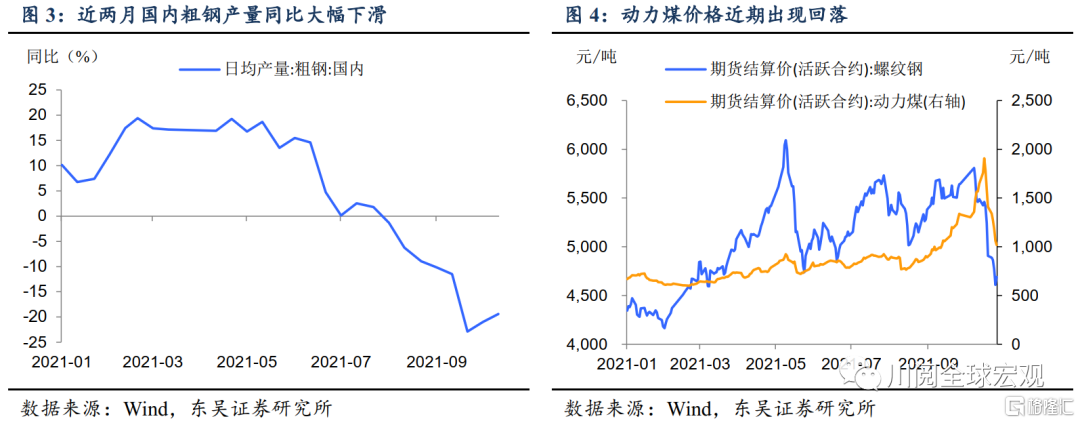 供给约束对10月制造业PMI的拖累进一步显现。10月制造业PMI为49.2%,较9月回落0.4个百分点,低于季节性(图1)。从分项看,生产和原材料库存是主要拖累项(图2),可见供电紧张、原材料价格偏高是10月制造业PMI超季节性下滑的主要原因。9月以来,在电力供应紧张和能耗双控的双重影响下,部分省份采取拉闸限电措施,全国粗钢产量显著下滑(图3)。供电紧张的背后是煤炭供应紧缺,动力煤价格今年以来快速上行(图4),对工业企业生产成本造成较大压力。