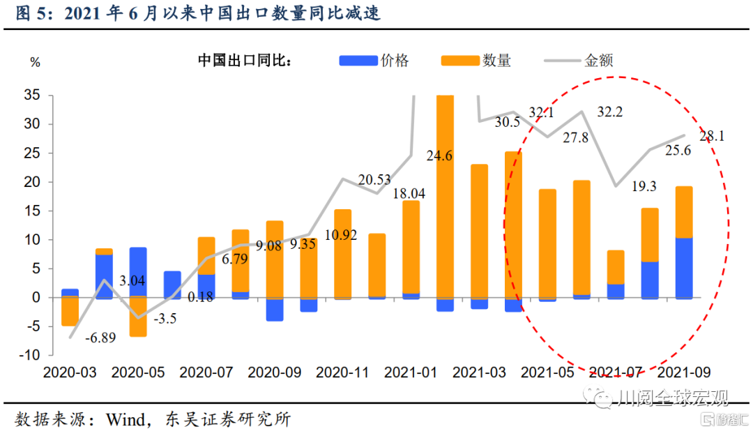 出口订单止住连续下滑趋势,但仍处于收缩区间。10月制造业新出口订单PMI结束此前连续6个月环比下滑,较9月回升0.4个百分点至46.6%。出口订单的收缩与近几月出口同比中数量贡献降低相对应(图6),我们推测其原因来自于以下三方面:一是海外持续复产后供需缺口进一步缩小,导致其对中国出口需求下降;二是各国宽松政策陆续退出导致需求边际放缓;三是高昂的运输成本导致企业进出口意愿下滑。