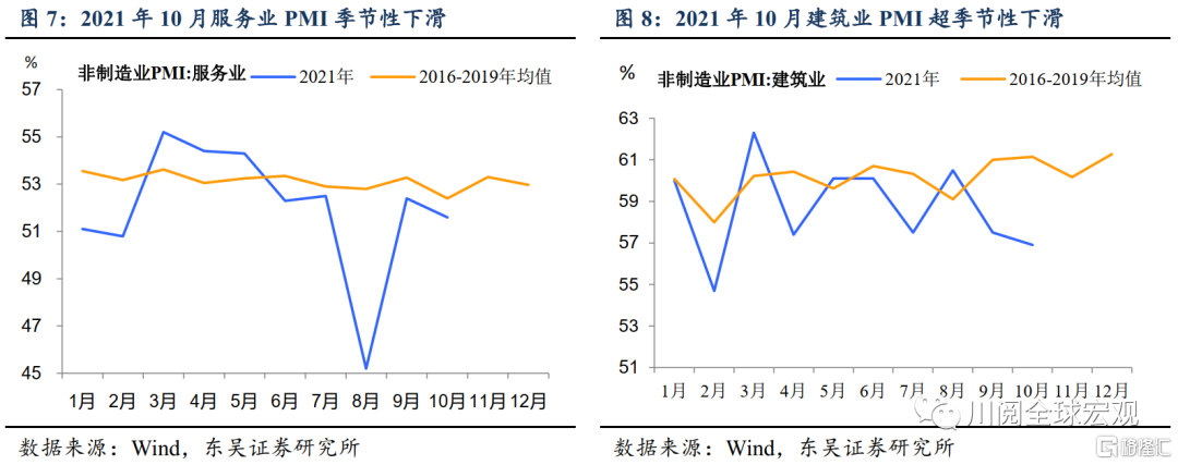 非制造业方面,10月服务业PMI较9月回落0.8个百分点至51.6%,环比变化略好于季节性(图7)(2016-2019年10月环比均值为-0.9个百分点)。9月、10月国内均有局部疫情发生,9月主要集中在福建省,10月主要集中在甘肃、内蒙古。由于福建服务业增加值占全国比重(2020年为3.8%)高于甘肃与内蒙古之和(2020年为2.4%),因此9月服务业受局部疫情影响更大,即剔除季节性因素后10月服务业PMI较9月实际上略有改善。
