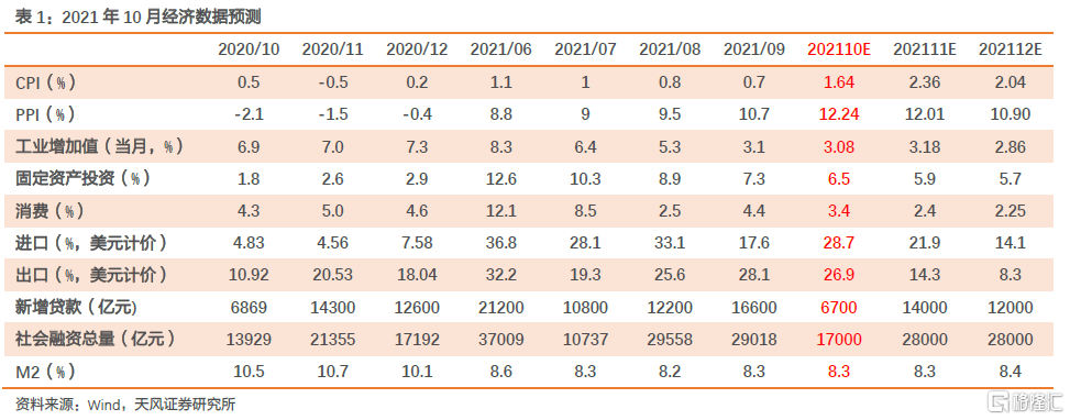 实体经济预测:预计10月工业增加值增速下行至3.08%;固定资产投资增速下行至6.4%左右;CPI同比为1.6%,PPI同比为12.2%;社零增速下行至3.4%。