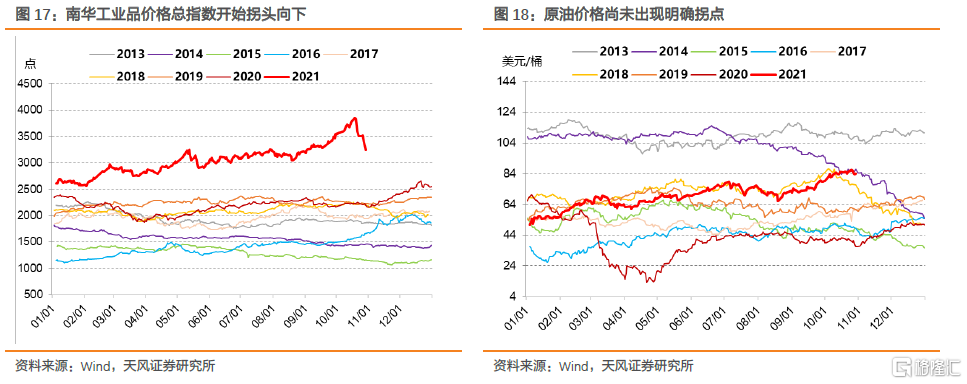 从PPI来看,近期政策端“增供稳价”措施相继落地,燃煤价格已经急剧下降至1100元/吨左右;大宗商品价格已经开始下行。但石油、天然气价格仍有上涨空间,未来需持续观察OPEC减产协议执行情况与全球能源需求走势。