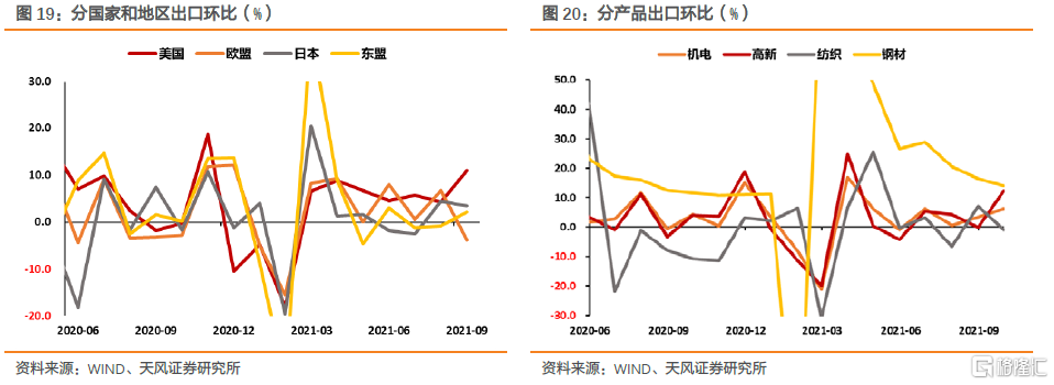 分国家和地区看,9月我国对美国、欧盟、日本与东盟的出口环比分别为10.97%、-3.78%、3.48%和2.21%,对除欧盟以外地区的出口继续扩张,对美出口明显加速扩张。
