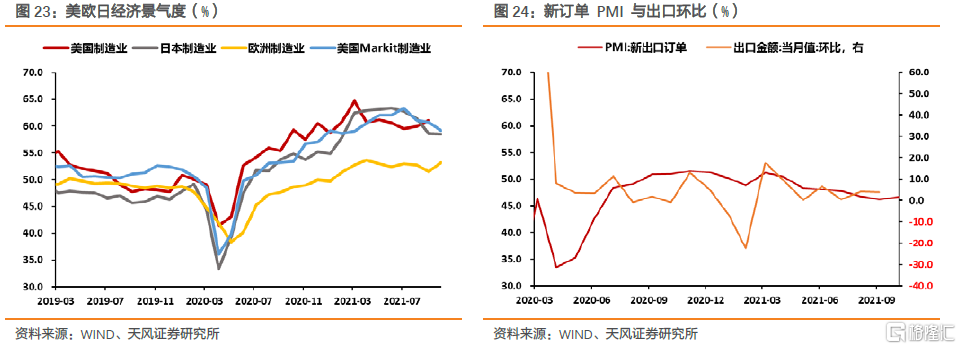 出口新订单PMI上行4个百分点至46.6%,仍持续低于枯荣线。