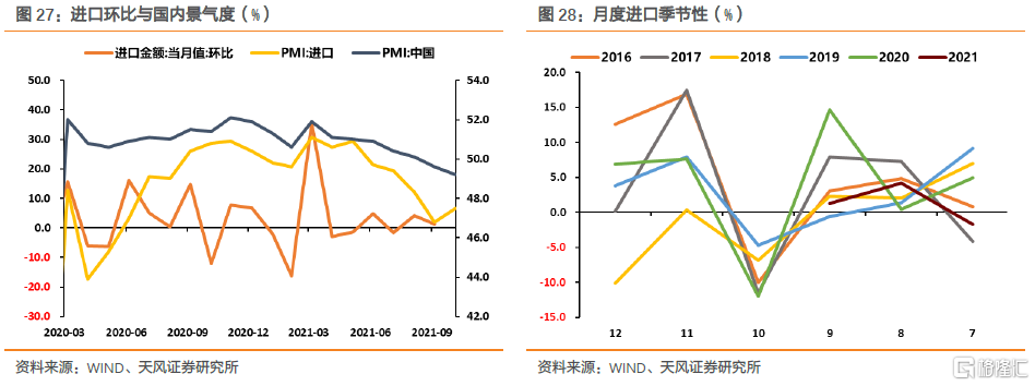 从季节性看,10月我国进口环比通常季节性为负。