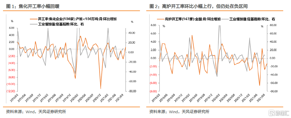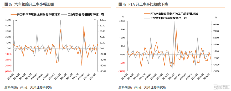 10月PMI生产指数回落1.1个百分点至48.4,连续两月位于临界点以下,创季节性最低水平。从采购量、新订单指数来看,需求端回落幅度相对较小,说明问题主要出在供给端限制。从高频数据来看,高炉、焦化和汽车轮胎开工率小幅回暖,但PTA开工率反而降低,说明工业生产动能仍然有诸多结构性问题。