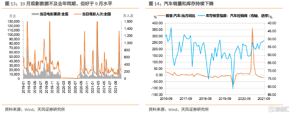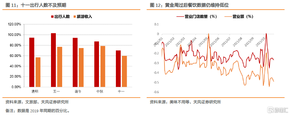 服务消费预计增长偏弱。10月服务业PMI下行0.8个百分点至51.6,仅略高于2019年同期水平,显示服务业增长动能整体偏弱。分行业观察,“十一黄金周”拉动之下住宿餐饮等行业商务活动指数表现较好,但由于疫情和天气影响导致消费者更倾向于短途游,运输行业扩张力度不及往年同期。从文旅部数据来看,疫情十一黄金周消费不及预期,且10月餐饮和电影数据有所背离,服务消费受疫情反复影响仍然不小。