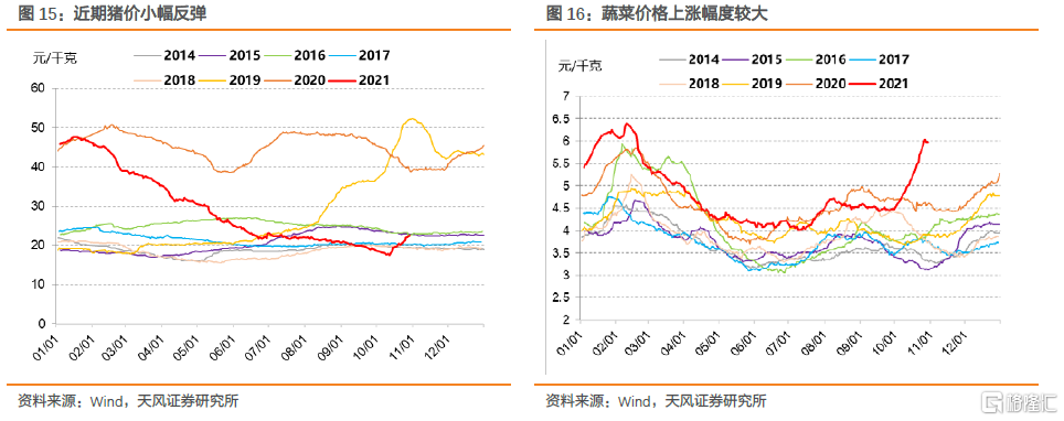 从CPI来看,本月猪肉价格小幅反弹、蔬菜价格上涨较多,短期内小幅推升CPI。