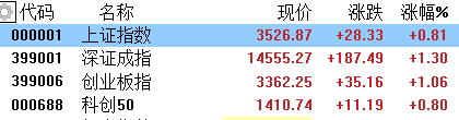 今日,三大指数集体反弹,沪指全天收涨0.81%报3526点,深成指涨1.3%报14555点,创业板指涨1.06%报3362点。两市个股普遍上涨,市场情绪及赚钱效应好转,成交量维持在低位,成交额连续十个交易日在万亿上方,北上资金净买入12.05亿。