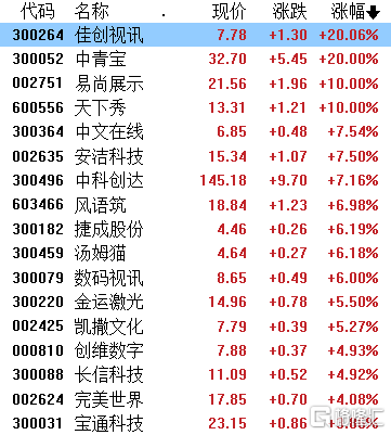 元宇宙板块领涨,国光电器一字涨停,佳创视讯、中青宝、易尚展示、天下秀涨停,中文在线、安洁科技、中科创达涨超7%,捷成股份、汤姆猫、数码视讯涨超6%,金运激光、凯撒文化、创维数字、完美世界涨超4%。