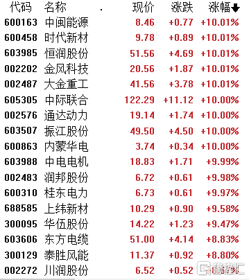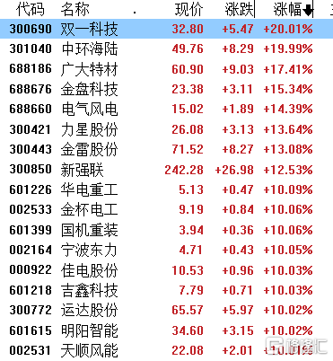风电板块狂掀涨停潮,双一科技、中环海陆、金盘科技、新强联、运达股份、天顺风能等23只个股涨停,桂东电力、上纬新材、华伍股份涨超9%,泰胜风能、川润股份涨超8%,节能风电、上海电气等跟涨。