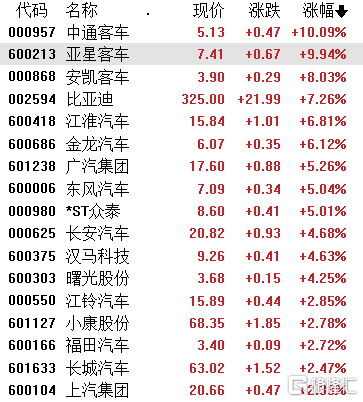 汽车板块涨幅居前,中通客车、亚星客车、ST众泰涨停,安凯客车涨超8%,比亚迪涨超7%,江淮汽车、金龙汽车涨超6%,广汽集团、东方汽车涨超5%,长安汽车涨超4%,小康股份、长城汽车等跟涨。