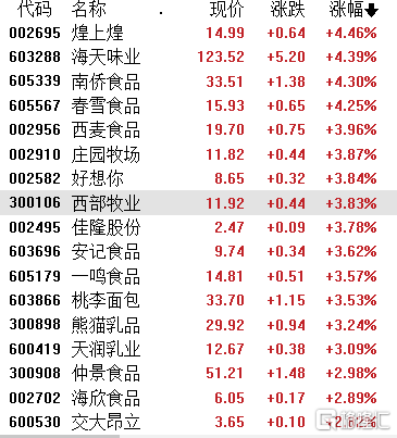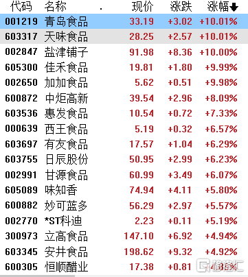 食品加工板块走强,青岛食品、天味食品、盐津铺子、佳禾食品、加加食品涨停,中炬高新涨超8%,惠发食品涨超7%,西王食品、有友食品等涨超6%,妙可蓝多涨超5%,立高食品、安井食品、恒顺醋业、煌上煌、海天味业等涨超4%。