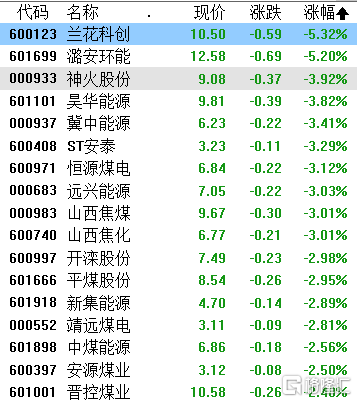 煤炭股跌幅居前,兰花科创、潞安环能跌超5%,神火股份、昊华能源、翼中能源、ST安泰、山西焦煤跌超3%,平煤股份、中煤能源、晋控煤业等跌超2%。