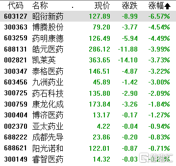 CRO概念股持续下挫,昭衍新药跌超6%,博腾股份、药明康德跌超4%,皓元医药、凯莱英、泰格医药、九洲药业跌超3%,药石科技、康龙化成、阳光诺和等跟跌。