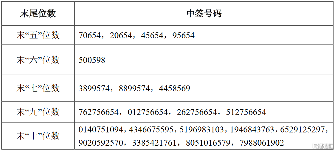 凡参与“锦鸡转债”网上申购的投资者持有的申购配号尾数与上述号码相同的,则为中签号码。中签号码共有 406713个,每个中签号码只能认购10张(1000元)“锦鸡转债”。