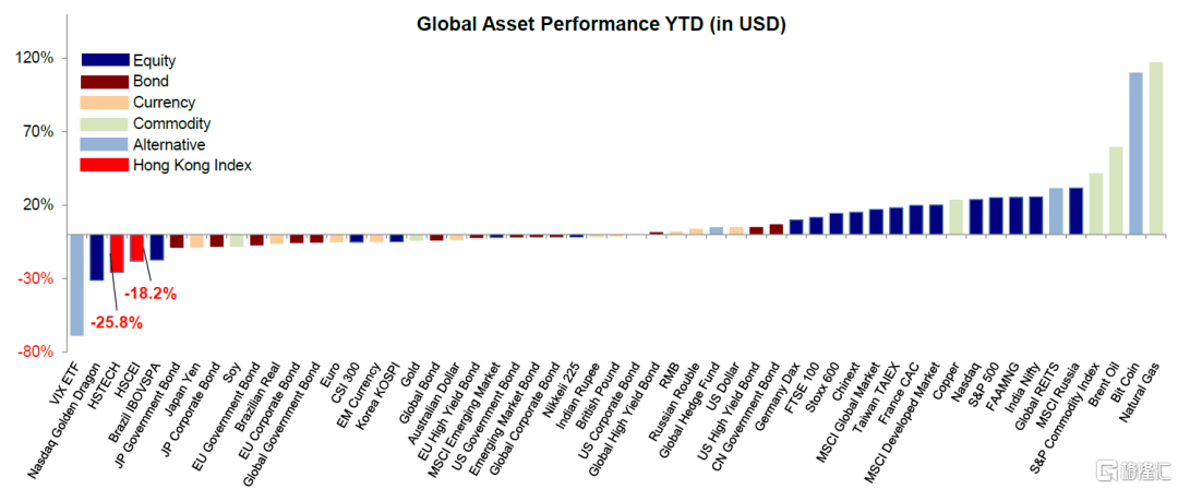 2021年海外中资股市场呈现“过山车”式行情,投资者收益不佳。在年初流动性驱动下大幅上涨后,海外中资股市场自2月中旬以来持续下跌,主要是受监管压力和债务违约等因素影响。恒生指数和MSCI中国指数年初至今分别下跌7.4%和16.6%。监管压力对各板块的影响程度不尽相同,恒生国企指数和恒生科技指数分别下跌18.2%和25.8%,表现落后于几乎全球所有大类资产。回顾过去,我们认为海外中资股市场2021年表现可以用以下几个关键词总结: