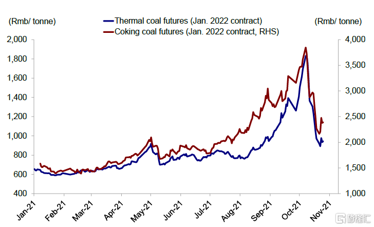 近期推出的政策侧重增加供给,煤炭价格大幅回落。面对近几个月煤炭供应短缺,中国政府加大措施确保煤炭供应。中国正在加大钢铁生产力度,强调可能会采取价格上限等其它措施推动价格企稳。此后,煤炭期货价格与高点相比跌幅超过40%。