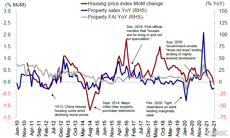 “房住不炒”vs. 需求走弱和信用风险:十四五以来,中国政府致力于降低经济增长对地产行业的依赖,强调向高质量发展转型。近期政府根据三条红线监管要求对高债务地产开发商贷款进行严格限制,而且多次重申“房住不炒”立场。资金收紧导致地产行业明显放缓,且加大了某些开发商面临的信贷风险。9月份产行业指标加速走弱。受抵押贷款政策收紧以及市场担心开发商可能无法按时交房等因素影响,销售面积出现下滑。9月房地产固定资产投资和新开工面积增速也转为负值。更值得警惕的是,住宅价格(住宅是家庭财富的关键组成部分)已经开始下跌。