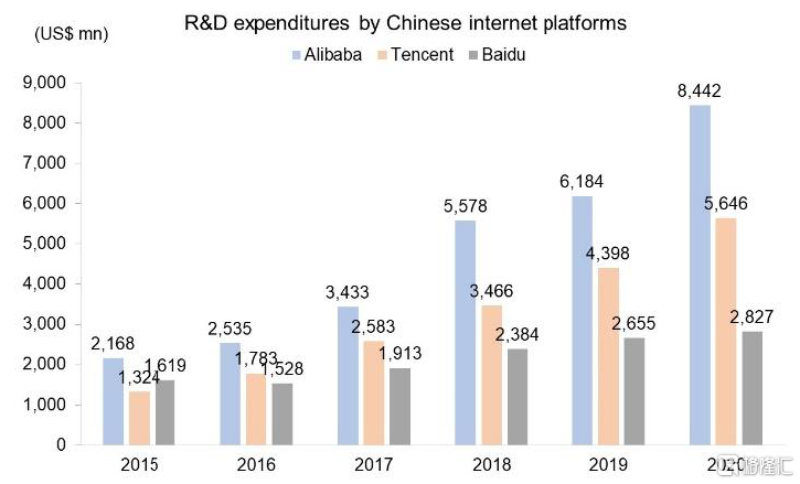 图表:阿里巴巴、腾讯和百度2020年研发支出共计170亿美元,占到中国民营领域研发支出总额的6%