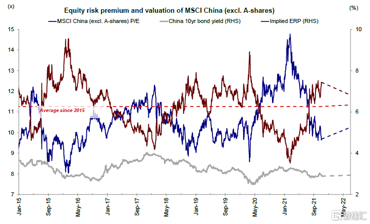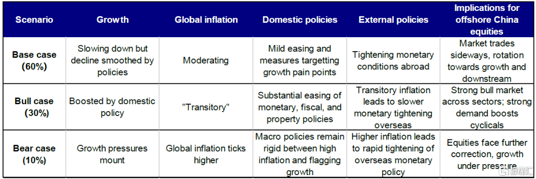 然而,我们认为转向更加宽松的政策立场虽小但仍为可能,但也可能维持较预期偏紧的宏观政策。我们这些情形将取决于国内外通胀的变化情况,其将对明年海外中资股市场产生重要影响。以下我们提供了两种情形分析:乐观情形(30%概率)和悲观情形(10%概率)。