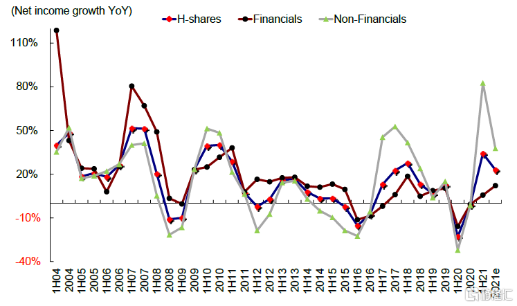 图表:在低基数推动下,2021年上半年海外中资股非金融板块净利润大幅增长…