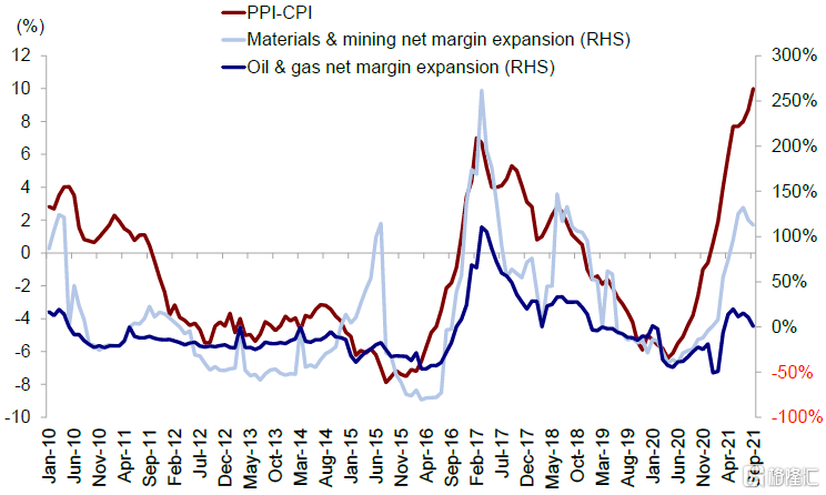图表:上游行业盈利能力与PPI和CPI剪刀差同步变化