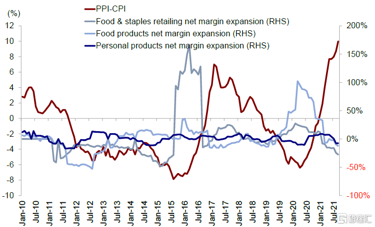 整体增速放缓:考虑到进入2022年中国经济可能逐步放缓(中金宏观组预计明年中国名义GDP同比增长7.8%),我们认为中国整体销售增速将回归正常化。在我们的基准情形下,内部增长不平衡问题可能会得到逐步纠正,上游通胀触顶,消费需求稳步回升。从自上而下角度,我们预计2022年海外中资股销售增速6.0%,略低于预期名义GDP增速。
