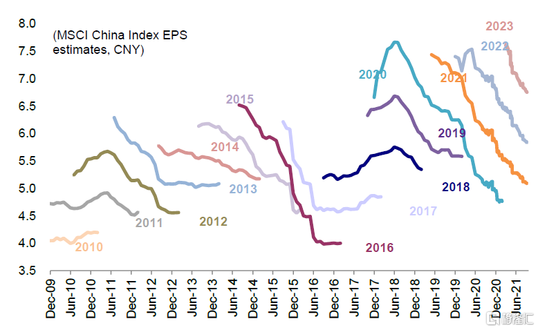 图表:MSCI中国指数每股盈利预测持续下调