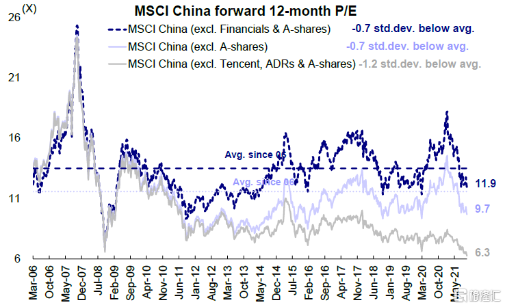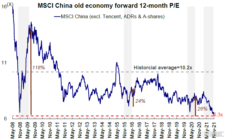 新经济落至历史均值以下,老经济降至绝对低位。受监管不确定性影响,新经济板块(MSCI中国指数,除A股和金融)估值大幅从2月份高点14.6倍下降34%至9.7倍,位于历史均值下方0.5倍标准差,降至2020年初疫情爆发时的水平。另一方面,老经济板块(MSCI中国指数,除A股、ADR和腾讯)市盈率继续小幅降至6.3倍,位于历史均值下方1.2倍标准差,为过去15年以来最低水平。