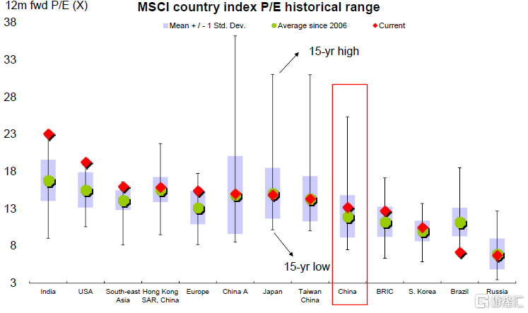 图表:MSCI中国指数整体市盈率低于历史均值