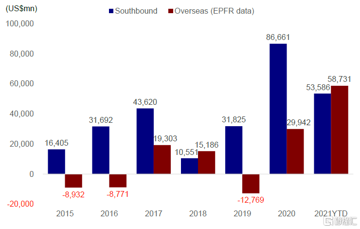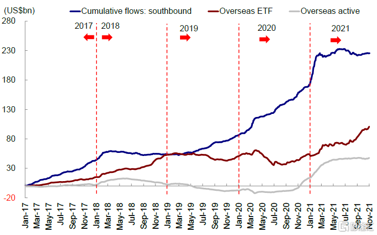 2021年,受市场波动影响,南向资金也出现大幅波动,而海外资金流入在不确定性环境下仍然保持韧性。