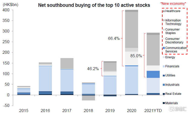从长期来看,我们认为香港股市中新经济占比不断上升将持续提升对南向和海外投资者的长期吸引力,主要逻辑包括: