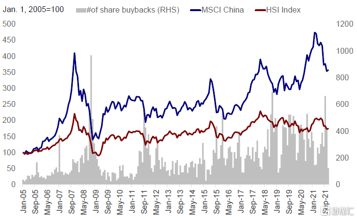 与此同时,随着今年A-H股溢价幅度扩大,H股目前估值水平与A股相比仍然存在更大折价。年初以来恒生科技指数表现不佳,与内地创业板与海外纳斯达克市场的大幅上涨形成鲜明对比。7月份以来,南向投资者对腾讯和美团等龙头科技标的持仓规模有所下降。但是,随着明年基本面回暖,我们认为南向投资者对龙头科技股的信心有望出现回升。另外,9月份香港市场共计出现663笔股票回购交易,创出有史以来月度第三高。股票回购交易的增加将进一步提振投资者信心。