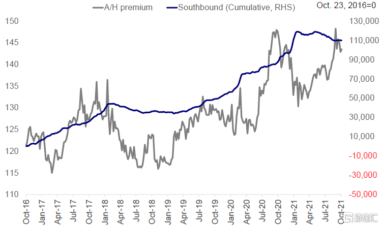 图表:A-H股溢价攀升至高点时,南向资金通常会大举流入