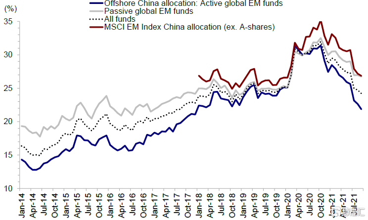 图表:投资于新兴市场的海外主动型基金目前低配海外中资股