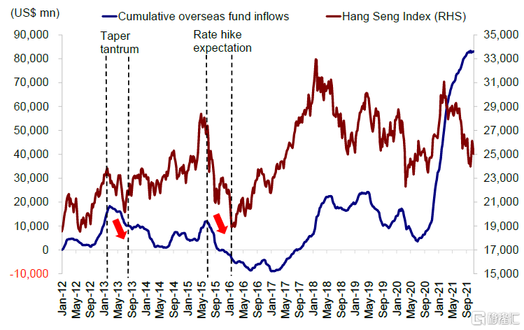 在这一情形下,海外中资股市场有可能存在压力。海外资金流出规模攀升,由于全球流动性快速收紧以及收益率大幅上升,成长标的可能表现明显落后。